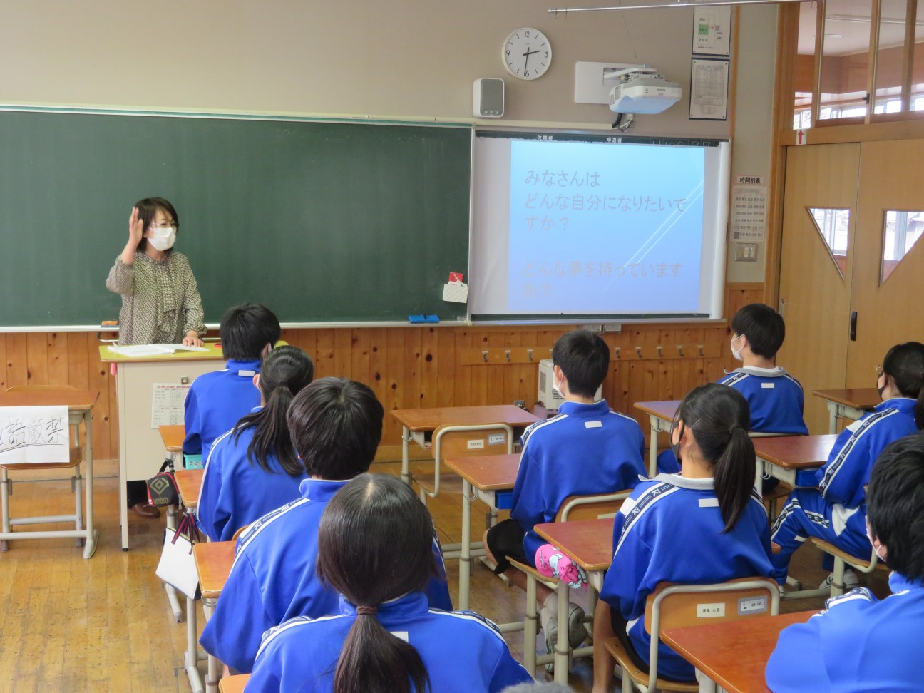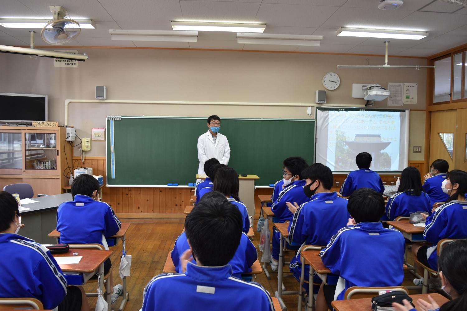 北方地区の5人の薬剤師が各クラスで、同時刻に薬物乱用防止講座を開催(北方中学校にて)
