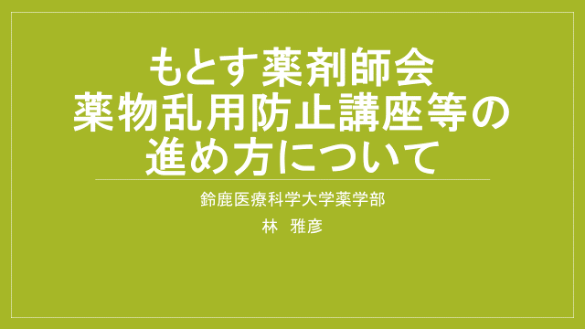 開催日 10月26日(火) 開始時間 13:45 ~ 15:15 開催場所 Zoomによるオンライン研修 研修内容 薬物乱用防止講座の進め方について 講師 鈴鹿医療科学大学 薬学部 薬学科 臨床薬学センター 教授 林 雅彦 先生 |