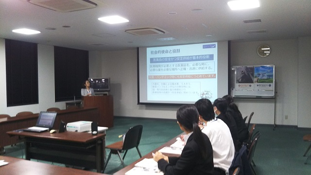 2019/04/10 もとすコアカリ研究会 【日時】 平成31年4月10日(月)13:30~15:30【内容】 『医薬品卸業について~株式会社スズケン見学会』【場所】 株式会社スズケン岐阜営業部 岐阜支店(岐阜市六条大溝3-4-18) 実習対応: 株式会社スズケン 岐阜営業部 吉村管理薬剤師 参加者:実習生4名 同行薬剤師2名(西川・池田)